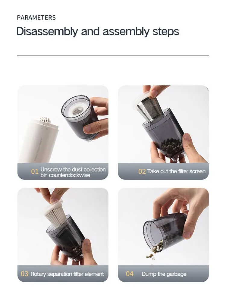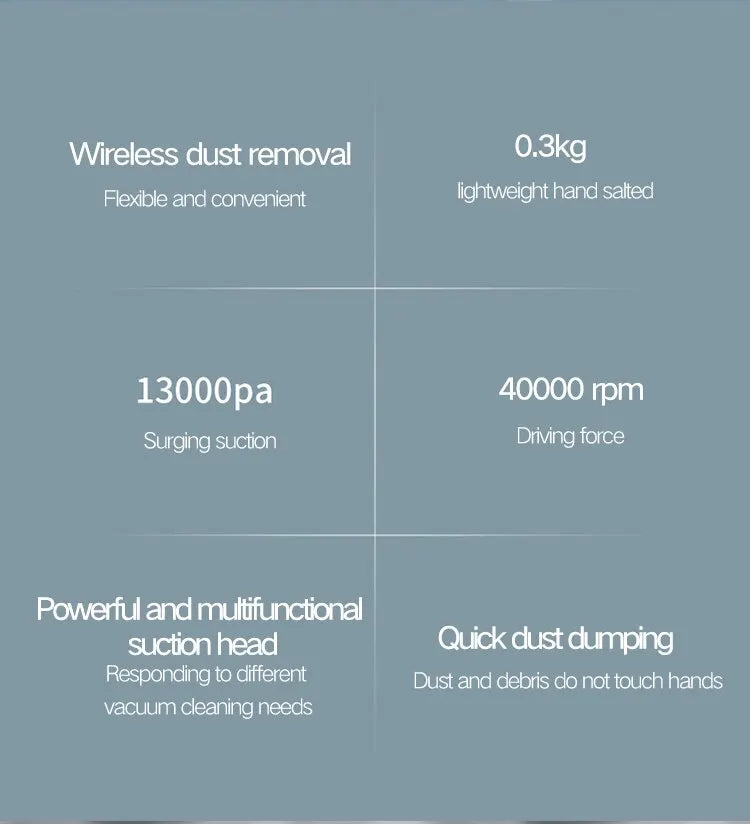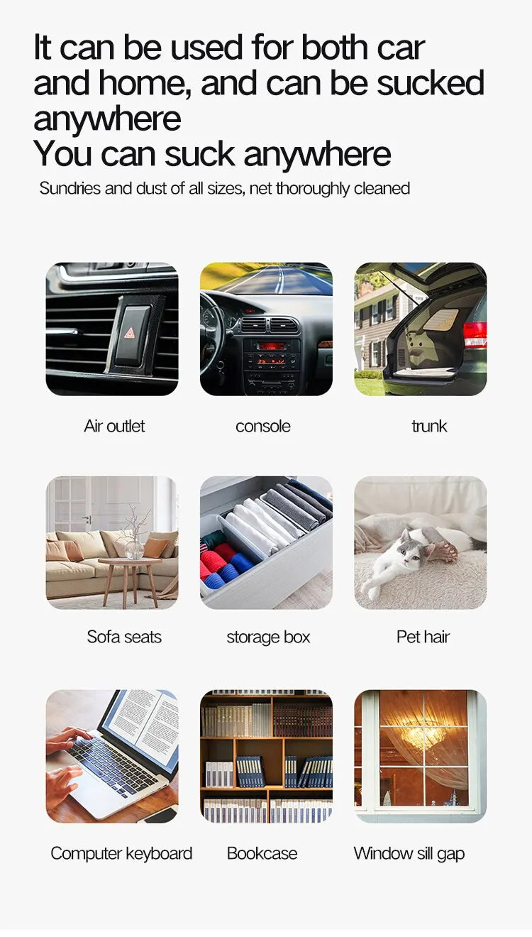 1. Powerful suction and long running time The high-speed brushless motor of the vacuum cleaner provides a powerful cleaning power, which lasts for about 25-30 minutes. It can quickly and deeply clean almost any small place that is hard to reach, such as the car interior, sofa, carpet,pet hair furniture, and even your keyboard!